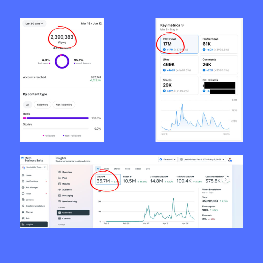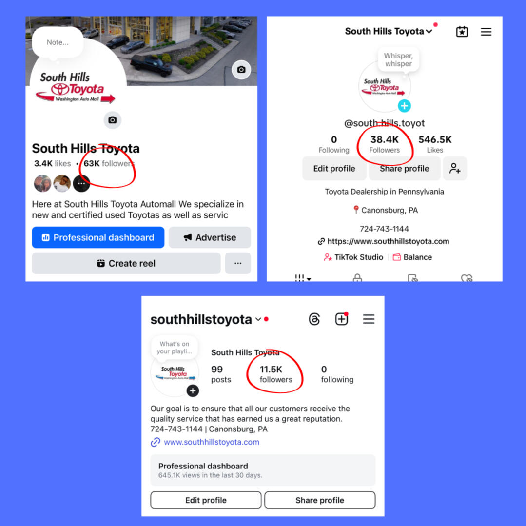 In just 90 days, Flow Media helped South Hills Toyota skyrocket to over 110,000 new followers and 50+ million organic views across TikTok, Instagram, and Facebook—making them the #2 most-followed Toyota dealership on TikTok in the U.S. Despite being a small-town Pennsylvania dealership, we turned them into a viral brand with national visibility. One video alone earned over $400 directly from TikTok’s Creator Fund, and we publish every single day—multiplying that monetization potential. Beyond content views, their reach is driving real leads and brand awareness, proving that with the right team, any dealership can dominate online.